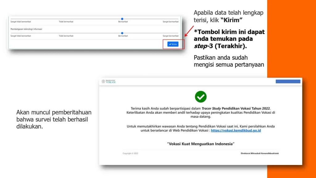Untuk mengisi Tracer Study, silakan akses tracervokasi.kemdikbud.go.id